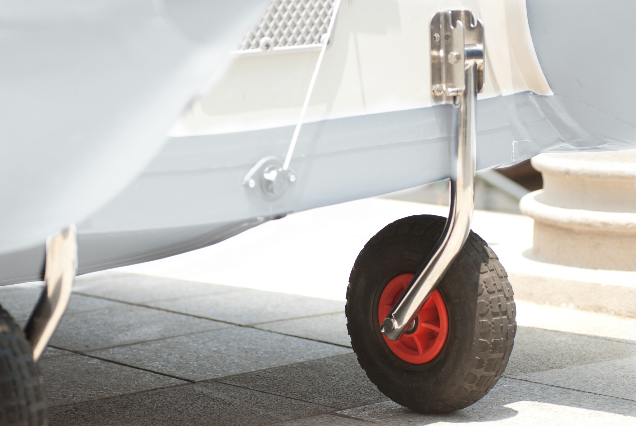 These are the Aqua Marina launch wheels, specially developed to help you bring your inflatable boat to the water. With this set, you no longer need to carry your boat—instead, you can easily roll it to the water. The Aqua Marina Dolly Wheels Set is simple to attach using the included screw set.