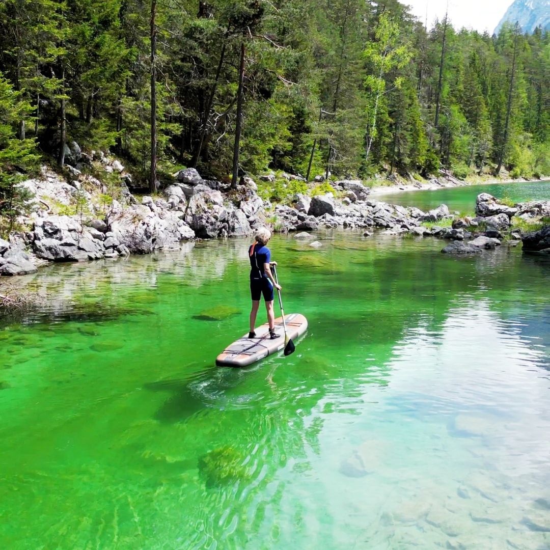 Het is een van de weinige plekken in Zuid-Duitsland waar je zó dicht bij de bergen kunt suppen. De besneeuwde toppen van de Zugspitze spiegelen in het glasheldere water, en op sommige momenten heb je het meer helemaal voor jezelf.