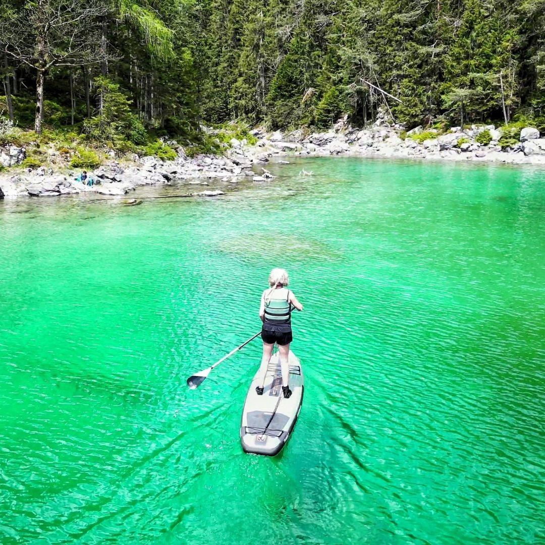 Je zou het bijna niet geloven, maar dit kleine meertje ligt op slechts een paar minuten lopen van de Eibsee zelf. Terwijl daar honderden mensen op het water dobberen, peddel jij in alle rust over de Untersee, waar het water nog helderder is en je tot op de bodem kunt kijken.